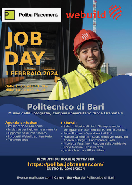 Il primo febbraio si terrà un evento di placement che vedrà coinvolta la spa Webuild, un gruppo multinazionale italiano che opera nel settore delle costruzioni e dell'ingegneria civile per parlare di prospettive future in azienda per studenti e carriera per laureati.